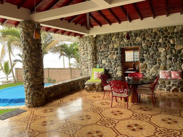 This amazing 26,910 square foot estate was built right on that beach, and is now available for purchase. This is a very special and well-built home, unique in design, materials, structure, and décor. Stonework is prominently featured throughout, and each stone on the house is Ecuadorian river rock that will last for generations. Not only is this a beautiful design feature, it is functional as well, with the stones providing so much natural insulation that air conditioning is unnecessary in the warm season, and will remain comfortable and dry in the rainy season, plus you will not hear any noise from the street outside of the property.